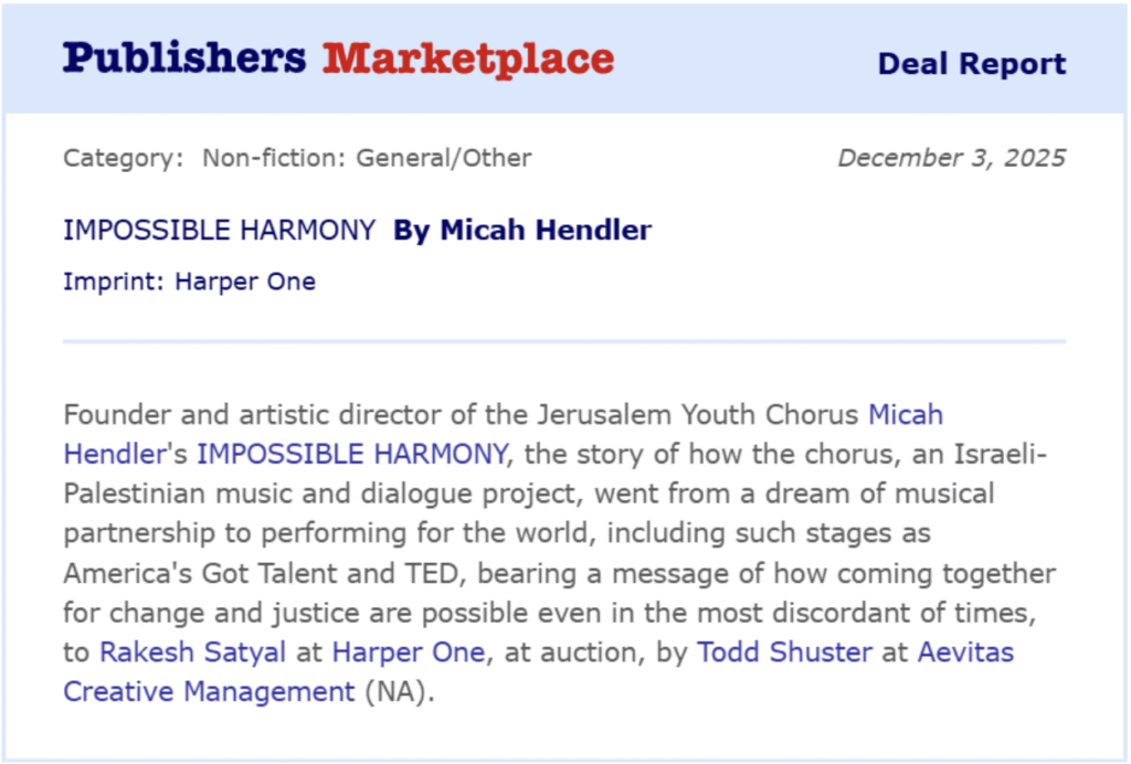 After more than a decade of building the Jerusalem Youth Chorus together, I’m finally writing the book that tells our story. It’s called Impossible Harmony, and it will be published by HarperCollins in Fall 2027.