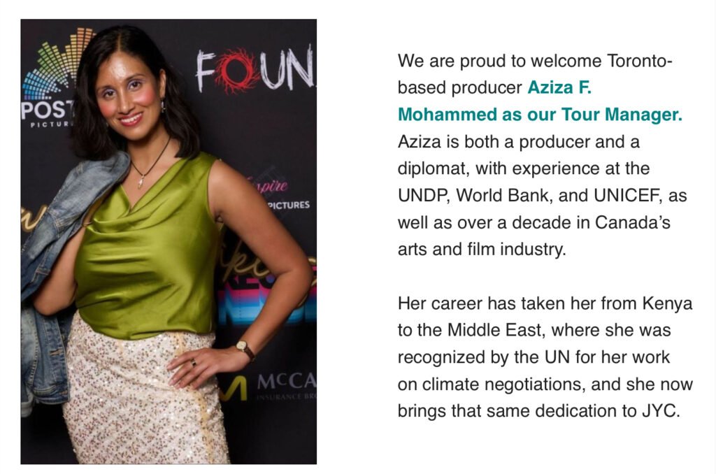 Combining global experience, deep local connections and remarkable vision, Aziza is ensuring our singers not only experience a seamless and inspiring tour, but also engage in deep cultural exchange and meaningful encounters across Toronto.